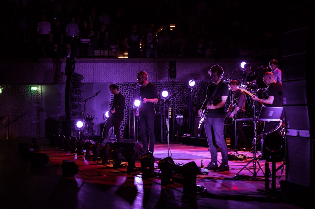 Pünktlich um 21 Uhr wurde es ruhig im Großen Saal der Elbphilharmonie. Die Bühne wurde in schimmerndes Licht getaucht und die Band betrat die Szenarie. Lauter Jubel ertönte, wie so oft an diesem Abend und die meist sieben bis neun Personen auf dem Parkett stimmten „Nobody Else Will Be There“, vom neuen Album Sleep Well Beast an. Unterstützt wurden sie dabei von Lisa Hannigan, die am Vorabend schon ein Konzert mit Aaron Dessner spielte und gelegentlich wieder auf die Bühne kam, um die Songs mit ihrer außergewöhnlichen Stimme zu untermalen. Das Bühnenbild war recht schlicht gehalten und wurde durch eine stimmungsvolle Lichtshow ergänzt.